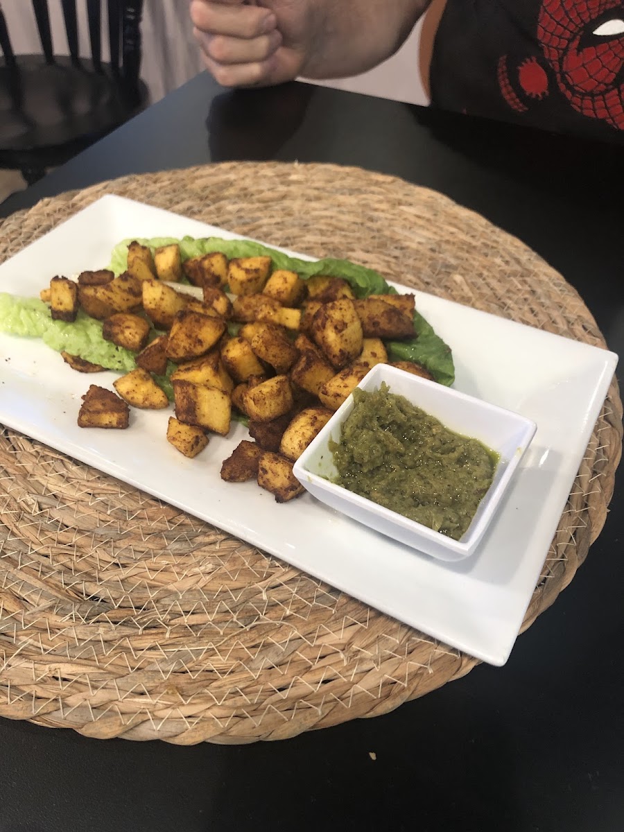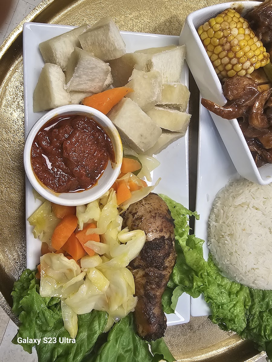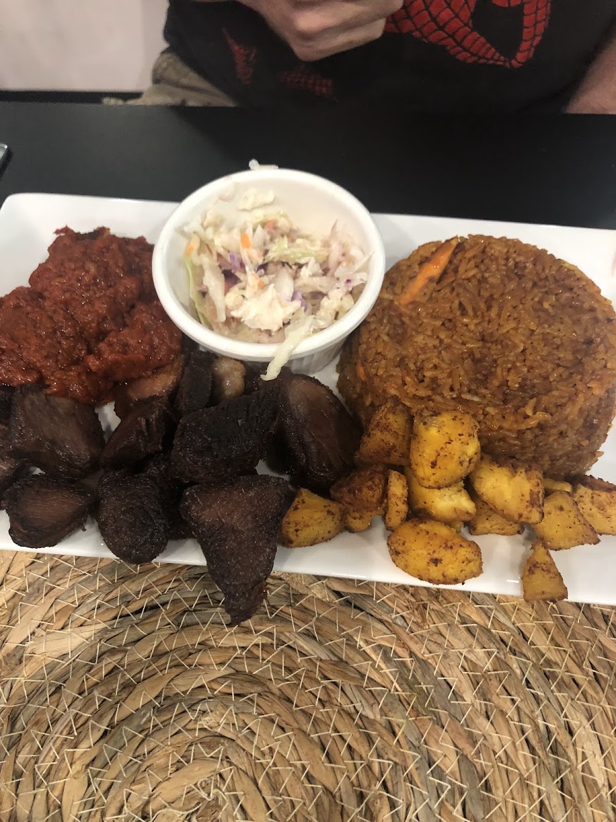 Food was absolutely delicious. This will definitely be one of our new favorites. We got the fried plantains, suya, Jollaf rice with beef, and the curry goat. Everything was just the right amount of spice and flavor. The plantains were an especially big hit for my kids. We dined in and will definitely do so again as a date hopefully very soon!